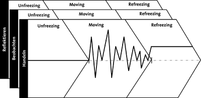 Die drei Phasen nach Lewin (unfreezing, moving und refreezing) lassen sich um drei Lern- und Reflexionsstufen erweitern: Handeln, Beobachten und Reflektieren.